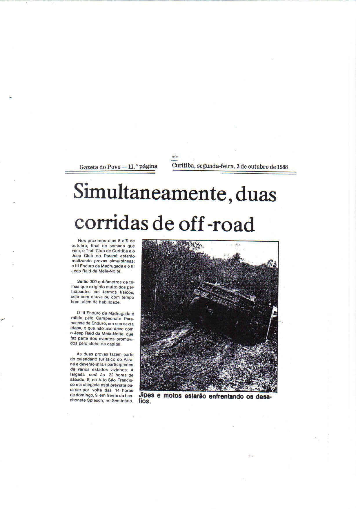 Aliás vou te contar um fato que aconteceu comigo, quando eu era criança sempre que podia ia assistir corridas de qualquer tipo desde que fossem de moto, me lembro quando começou o motocross ainda na antiga rodovia do Café perto do Parque Barigui, onde corriam o saudoso Nivanor, o Avestruz, Celso Seixas e outros, quem estava lá organizando o evento? você.