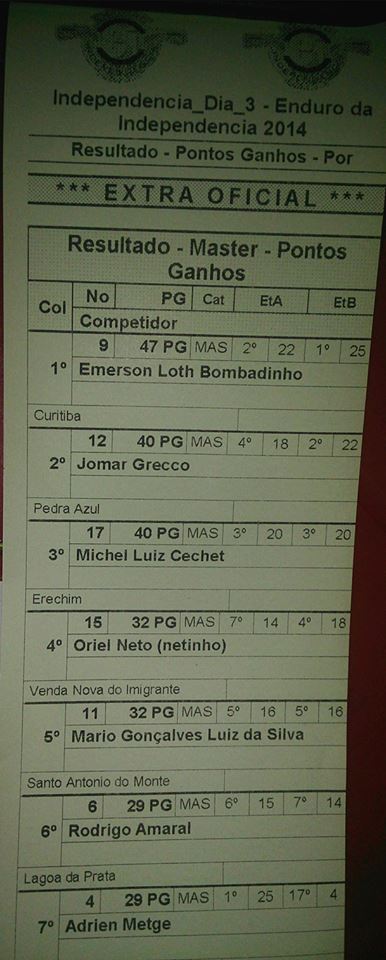 O Enduro da Independência é realmente um grande desafio para qualquer piloto. Não será na primeira vez, nem na segunda que um forasteiro vai lá e fica bem colocado. É tudo muito diferente, TUDO. Começando pelo terreno, passando pela planilha, pela seleção de adversários, até pela maneira do organizador enxergar uma prova de enduro. Não que seja mais difícil do que outras que temos aqui, mas simplesmente, DIFERENTE. Por isso é que vale muito a pena a experiência. O enduro mais difícil que já participei continua sendo um Enduro dos Pampas, mas tbm isso não significa que seja um enduro difícil. O que é difícil para alguns, é fácil para outros. Tudo é uma questão de referência. Quem nasceu patinando no gelo, certamente terá muitas dificuldades em correr num mar de pedras e a recíproca tbm é verdadeira. É difícil p/ nós acelerarmos nas pedras, assim como é difícil para os mineiros acelerarem no terreno molhado e liso. Isso fica muito evidente à medida que o terreno vai mudando dentro de uma competição como o Independência. Os mesmos mineiros que te passavam no primeiro dia, te dão lado no último... haha... é realmente engraçado. Eqto eles são amigos das pedras e as usam como suas aliadas, usando-as como rampa para saltar degraus e se escorando nelas p/ fazer mais rápido as curvas, nós somos amigos da lama e a usamos para escorregar, tangenciar e chegar mais rápido à parede da curva. Fora estas dificuldades de buscar tração, muito particulares de cada um, há ainda alguns outros fatores que ajudam a apimentar o EI, e um deles é que lá estão os melhores pilotos do país. Ou seja, errou alguns segundos, perdeu posições. E infelizmente, errar lá é fácil, justamente por causa da questão da referência de cada um. Estamos acostumados a não encontrar erros de planilha por aqui. Já lá, é tão costumeiro que nem são considerados como erros. 100 metros? "Ah, vc deveria ter insistido um pouco mais!!!"... haha. Mas não condeno, pois eu sei o qto seria difícil, depois de pronto, repassar conferindo 3, 4 ou 5 vezes um roteiro de 800 km, como fazemos aqui.
