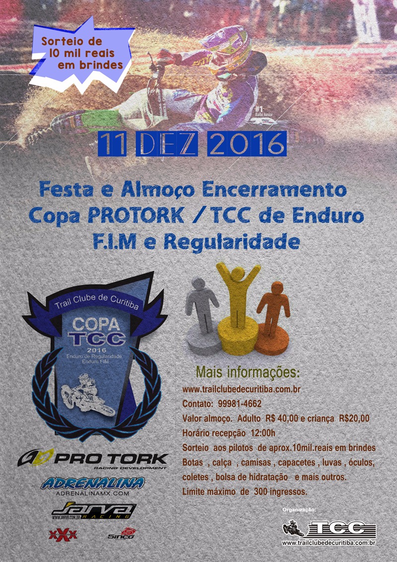 No ano passado, entre patrocinadores, convidados, pilotos e familiares, tivemos 363 pessoas presentes no almoço, mas para um melhor atendimento, este ano teremos apenas 300 convites à venda. Portanto, vale a pena se adiantar e garantir os seus convites que estarão à venda com as equipes organizadoras do TCC ou na loja Adrenalina MX.