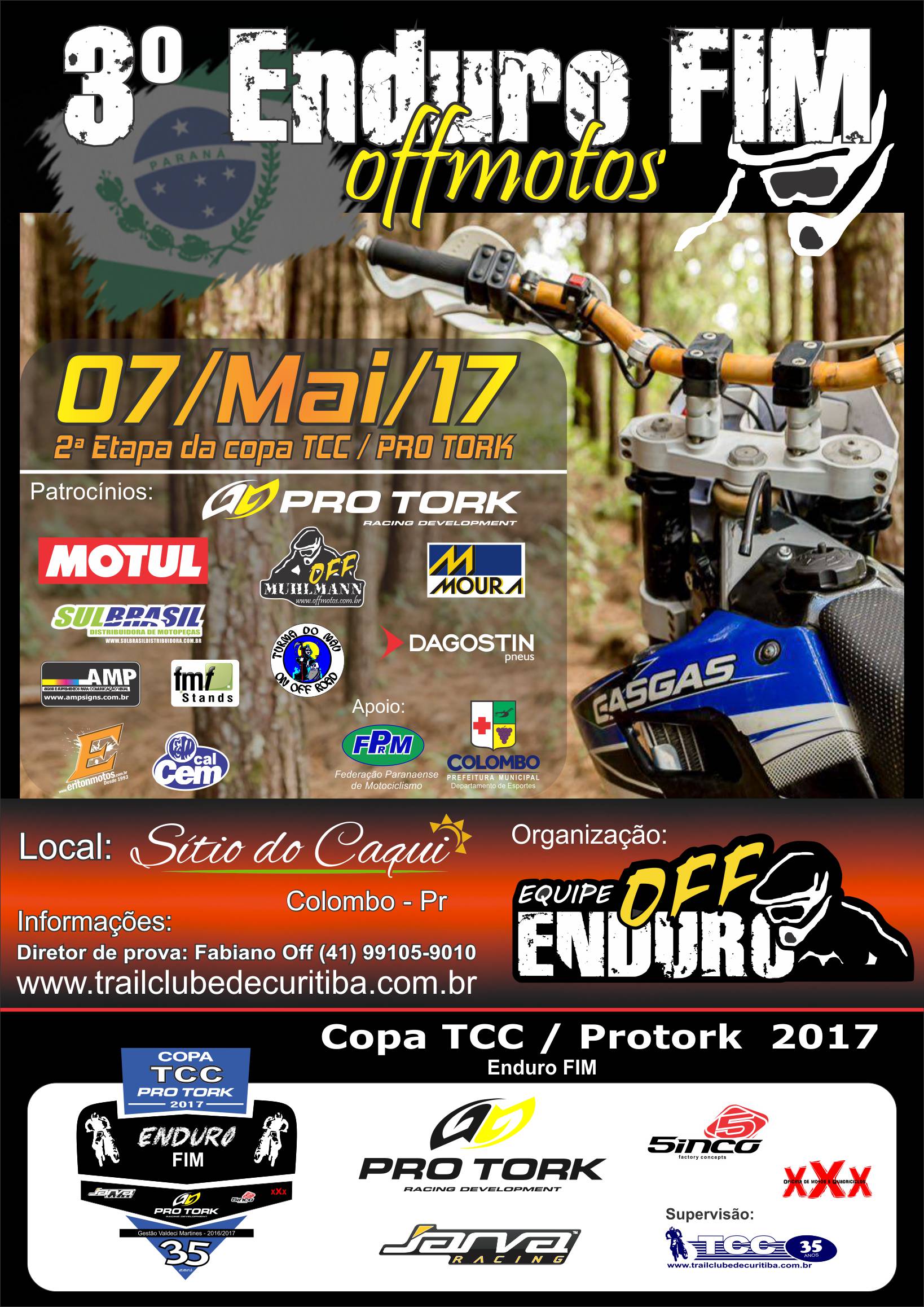 ENTREGA DOS NUMERAIS: No Sitio do Caqui – Colombo, no sábado dia 06 de maio de 2017, a partir das 10:00 na barraca da Equipe montada no parque. Sorteio dos numerais será realizado dia 05 de maio de 2017 e a ordem de largada postada no fórum do TCC a partir das 20:30.
