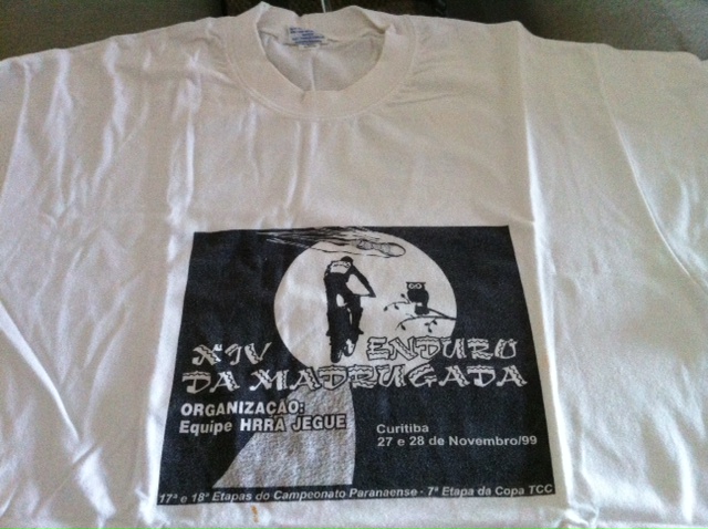 Estava dando uma olhada na gaveta com as coisas de enduro e olha o que achei: Uma camiseta do Enduro da Madrugada de 1999, organizada pela Equipe HRRA JEGUE. Nao me lembro bem de onde largou, mas se nao me engano foi no Taruma. Esta sera a 14 edicao que participo e posso dizer que nao existe nada igual, pretendo participar de pelo menos mais 20 futuras edicoes. No mais um grande abraco a todos e boa prova.