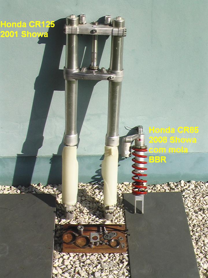 Vendo conjunto Kit Suspensão Invertida de Honda CR125 + Amortecedor especial de Honda CR85 com mola BBR (mais dura). R$ 2.990,00. Em ótimo estado, sem vazamentos e sem defeitos. Suspensão com óleo e retentores novos. Deixe sua CRF230 com ciclística de moto especial. Tenho na minha CRF230 e recomendo muito.