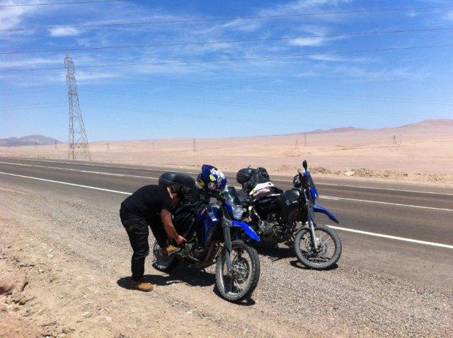 Em Calama encontramos um chileno (Ramon) que iria até Iquique com sua Suzuki 250cc e pediu para nos acampanhar. O velinho tocava demais a motinho, não desgrudava da gente em nenhum minuto.